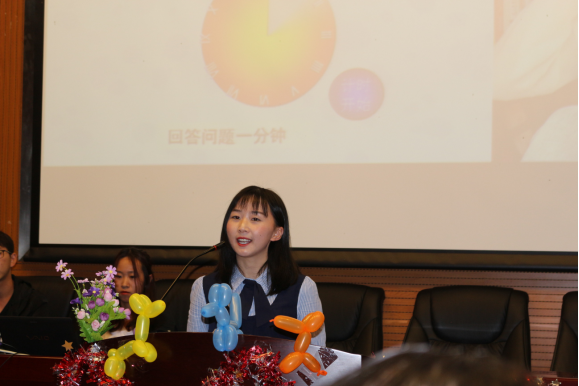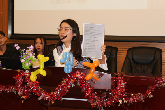 比赛现场坐无虚席,大家共同期待着这场盛宴。大赛共分为两个环节,第一环节为定题演讲,以“My Big Story in 2049”为主题,选手们自拟副标题,演讲时间为3分钟;第二环节为即兴问答,答题时间为1分钟。选手们有序上场、各展其才。面对评委老师的即兴提问,选手们有条不紊的回答和自信且饱满的精神面貌赢得了大家的阵阵掌声。选手们从不同角度对2049年的个人、社会、国家进行了思考,从AI、教育智能化等不同角度进行了描绘,引发了观众们的深刻思考。在比赛环节之后,主持人和观众进行了击鼓传花的游戏,由文艺部的7位同学带来的歌曲表演《Darkside》更是将现场气氛推向了高潮。