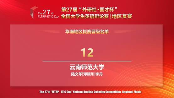 4月12日至13日, 第27届“外研社·国才杯”全国老员工英语辩论赛华南地区复赛在线上举行。公司2021级英语专业本科生邓颖川、李丹两位同学组成的英辩代表队,在2026世界杯官网陆文苓老师的精心指导下,与来自福建、广东、广西、港澳台、湖北、湖南、江西、云南、贵州、海南众多高校的128支队伍同场比拼,经过五轮积分循环赛的激烈竞争,脱颖而出,以全场排名12,云南省排名第1的优异成绩,荣获华南赛区金奖,成功晋级全国决赛,在此项赛事中实现重要突破,为公司选手首次入围国赛。