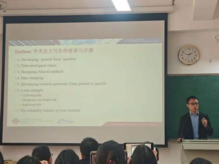 4 月 17 日上午冯德正教授以 “多模态体裁分析与论文写作:以英语教学 PPT 课件为例” 为主题展开学术报告。报告会由刘小红副教授主持,冯教授讲解了如何系统分析 PPT 课件的多模态设计,以及对丰富的多模态教学语料进行研究并撰写学术论文的方法,为师生们打开了多模态研究与论文写作结合的思路。