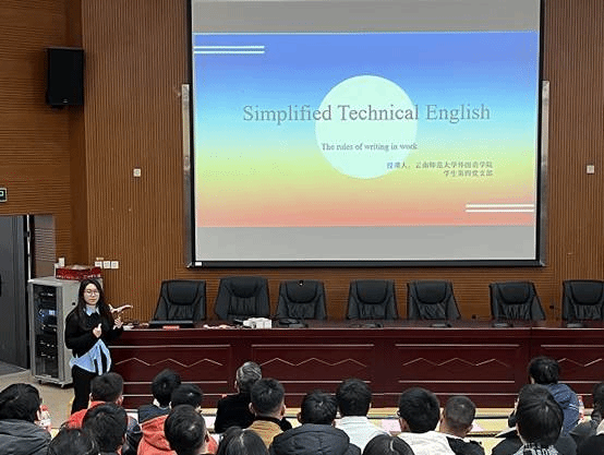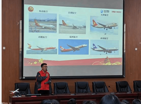 本次共建活动由教工第四党支部书记段红主持。在奏响国际歌后,与会党员集体面向党旗,重温入党誓词。随后由海航航空技术昆明航线维修一室党员王为东带来别开生面的民航安全知识科普小课堂。王为东从飞机的型号、特点、飞机安检流程、安全员日常工作流程等角度进行了讲解,并结合英语专业实际,介绍了英语在民航领域的应用及就业前景。