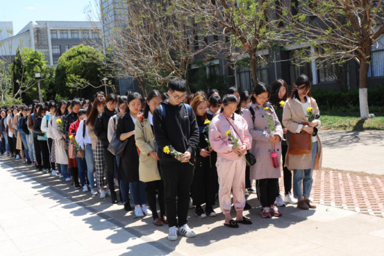 2019年4月4日下午15:00,清明节前夕,外国语公司组织全体员工党员在明德2幢广场纪念碑前举行献花仪式,缅怀维和英雄和志虹。