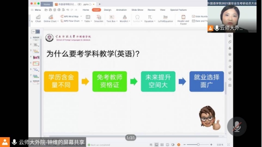 接着,钟维副经理结合同学们在考研意向问卷中普遍反映的问题和考研相关政策进行了答复和解读。钟老师首先解读了公司的考研鼓励政策,公司为所有报考研究生入学考试的同学全额报销报名费,对于录取到不同层次院校的员工给予相应奖励,并对报考公司硕士研究生学位的相关政策进行了解读,例如推免学科教学(英语)专业,学制为本科加研究生共六年,普通推免研究生学制为3年。钟老师从公司研究生各专业历年录取分数、录取人数、笔面试相关题型进行了介绍,对于小语种专业的同学建议从学科归属和应用前景去考虑自己的考研方向。还邀请了考研上岸的学姐和同学们分享了考研经验。