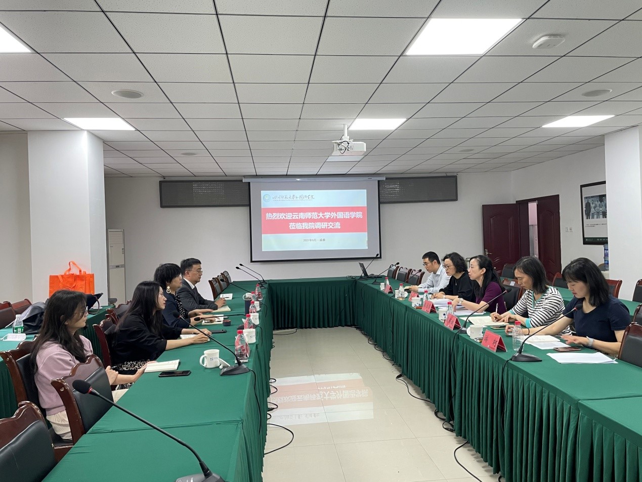 2021年5月19日,副经理钟维,英语专业负责人段红,日语专业负责人陈斌,英语专业基础教研室主任李琤,西班牙语教研室副主任张淼到四川师范大学公司开展调研与交流活动。四川师范大学2026世界杯官网秦洁荣、英语系主任段丽斌、日语系主任舒斌、评估办主任游轲、日语系副主任陈文参加了座谈会。