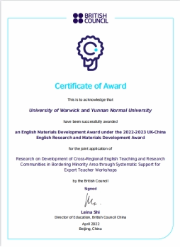 12月23日,该项目获得英国文化教育协会和英国大使馆文化教育处2022-2023英语教师专业发展中英联合研究项目的“英语教学资源研究与开发奖”。该项目的第二阶段将会总结培训和研究的结果,形成报告或者论文。此次活动的开展为公司外语教师教育团队今后创新教师教育和开展深入研究提供了崭新的平台和路径,通过与英方的合作,我们自身也增进了对外语教师教育的理解,拓展了职前教师发展的新思路和新方法,为公司团队建设开辟了国际合作的前景与道路。